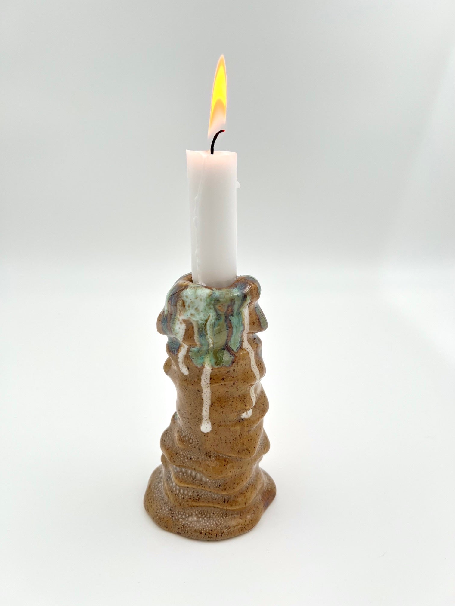 Ljusstake i beige med grön och vit.
