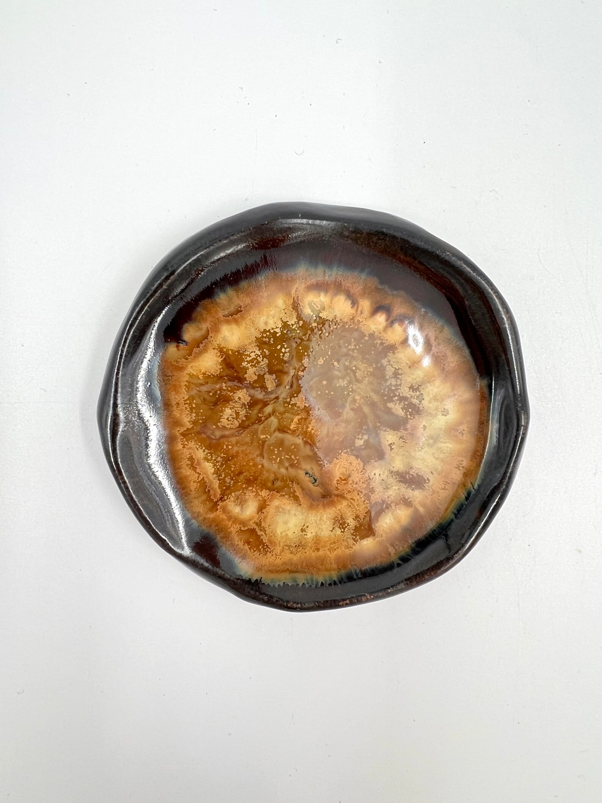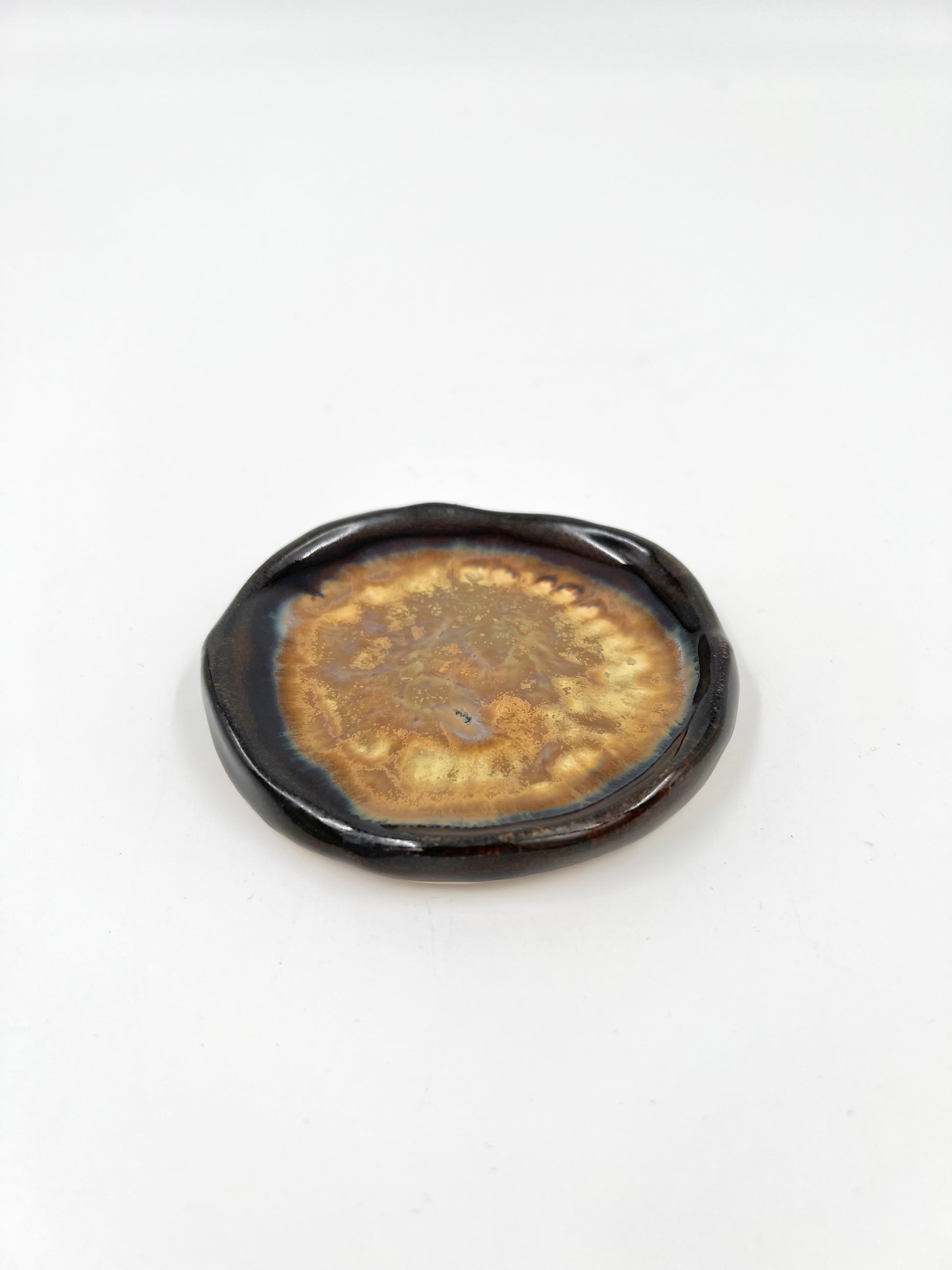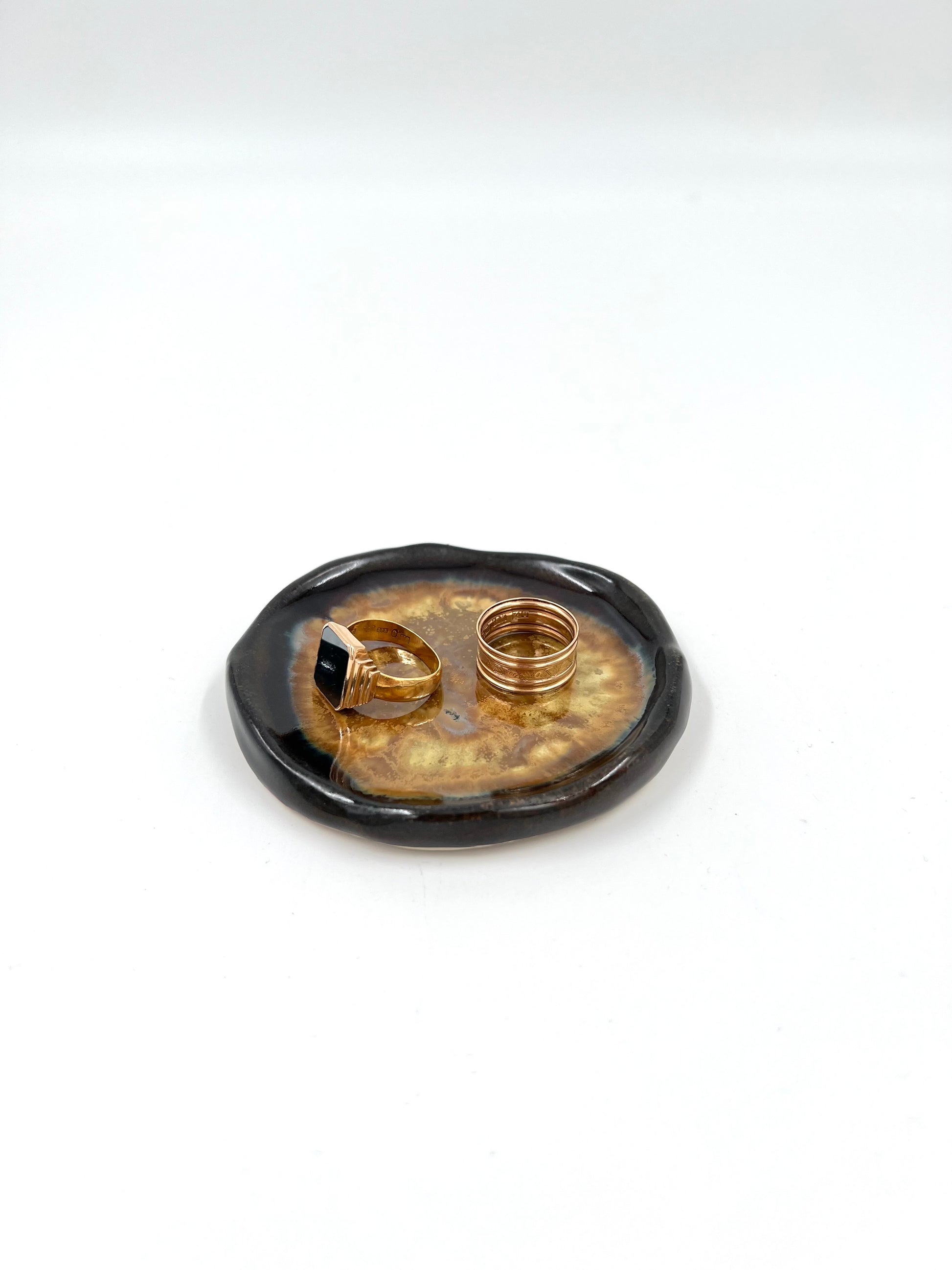 Litet fat i brun och guld.