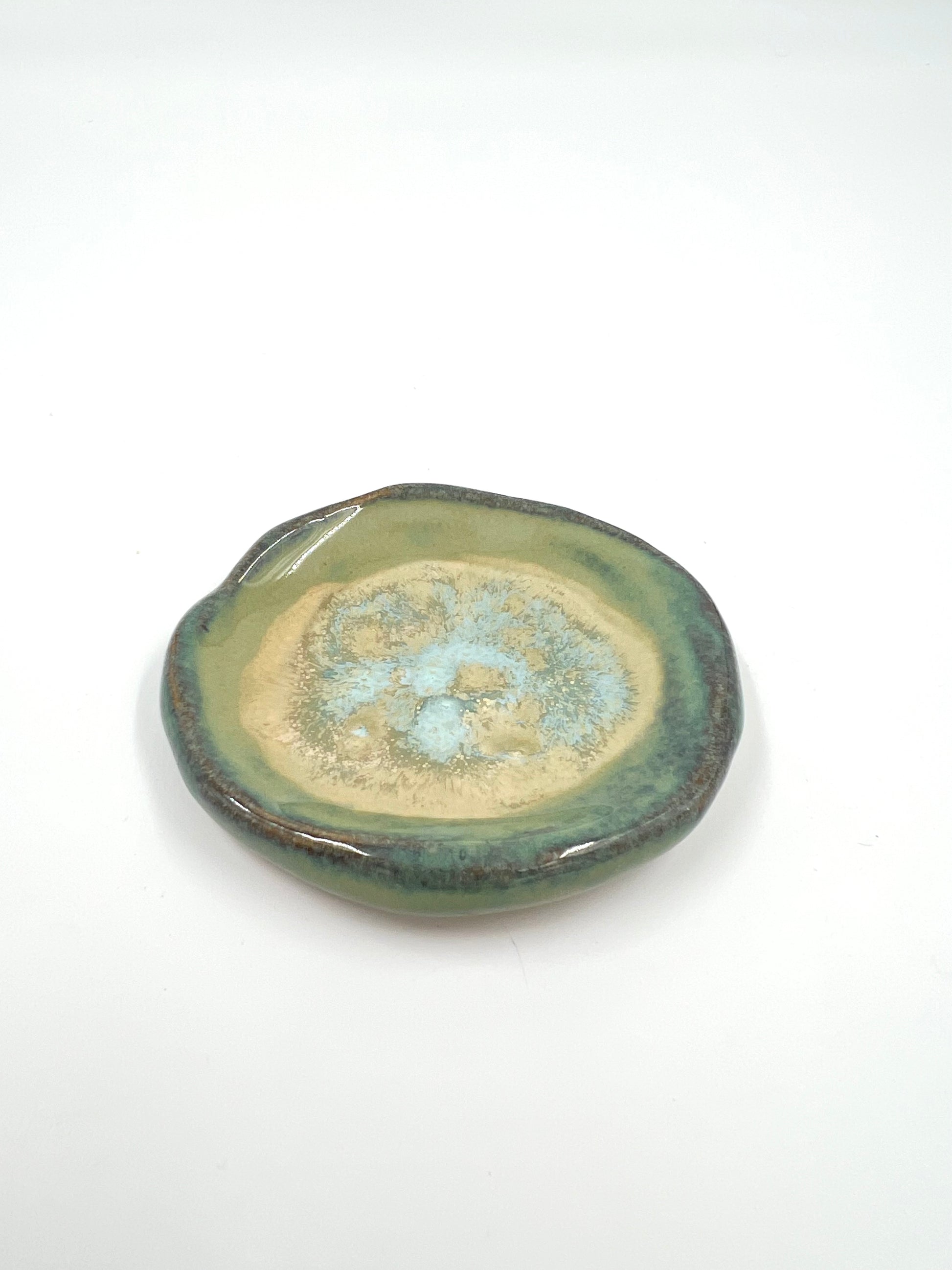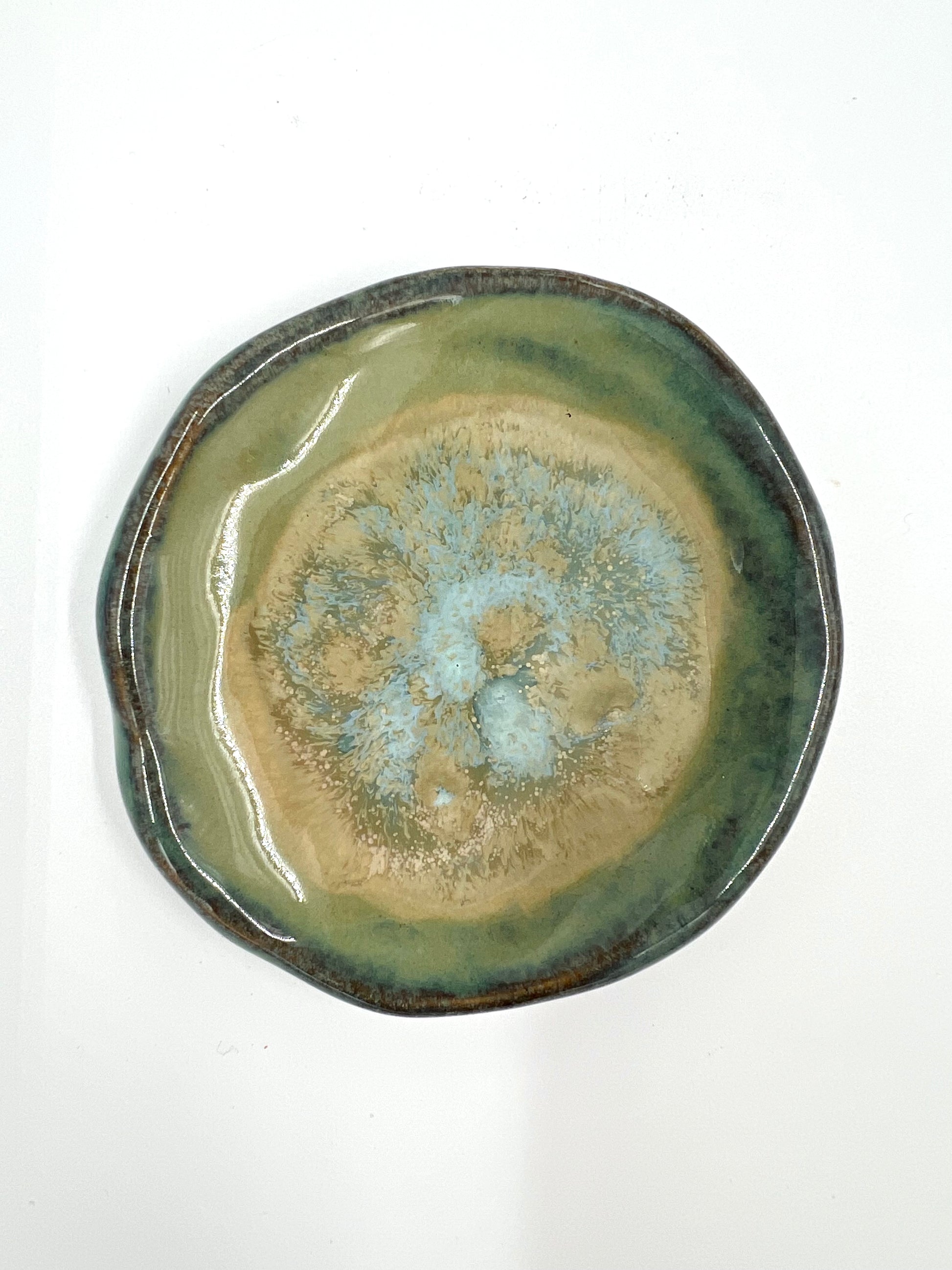 Litet fat i turkos och beige.