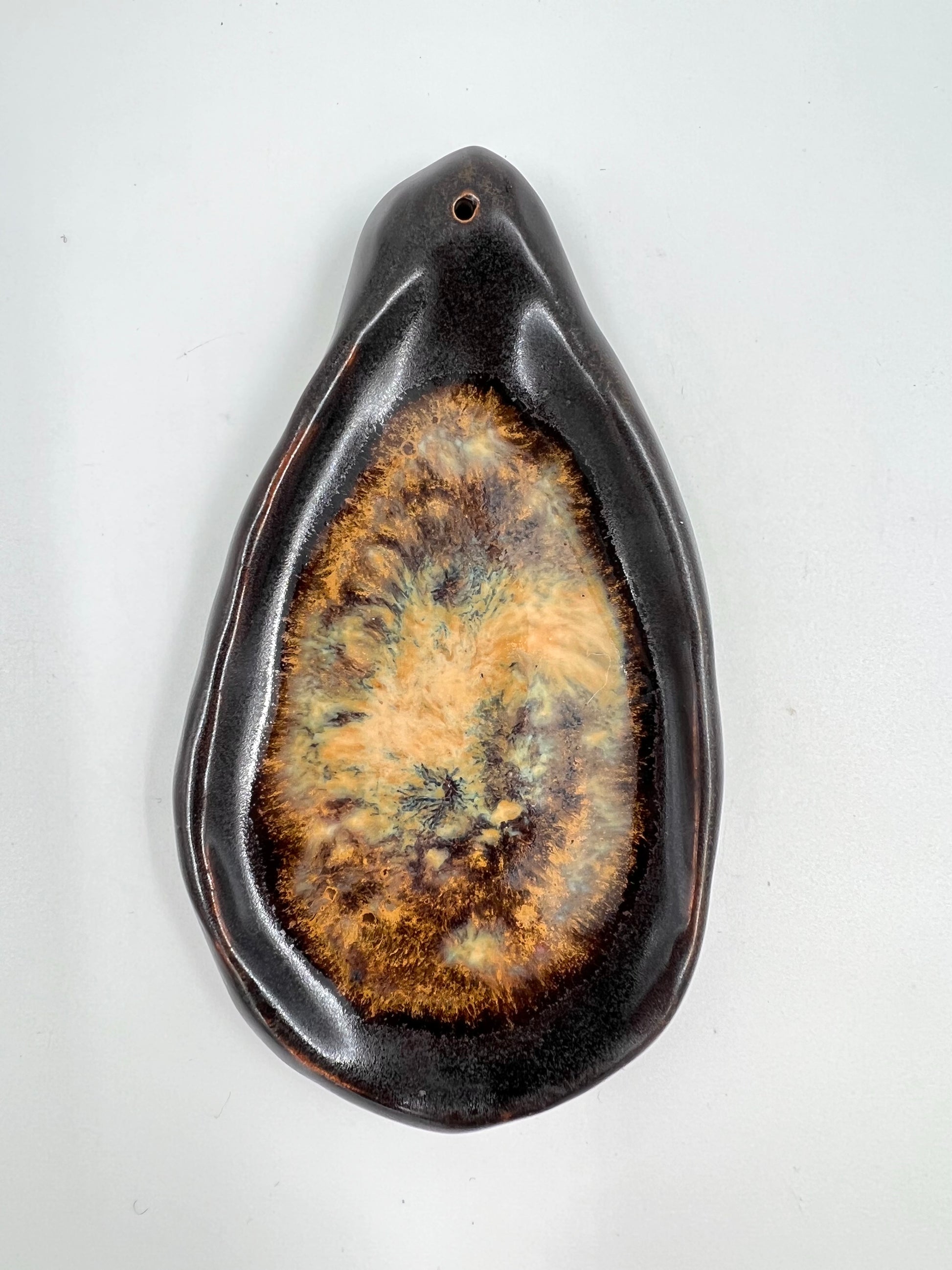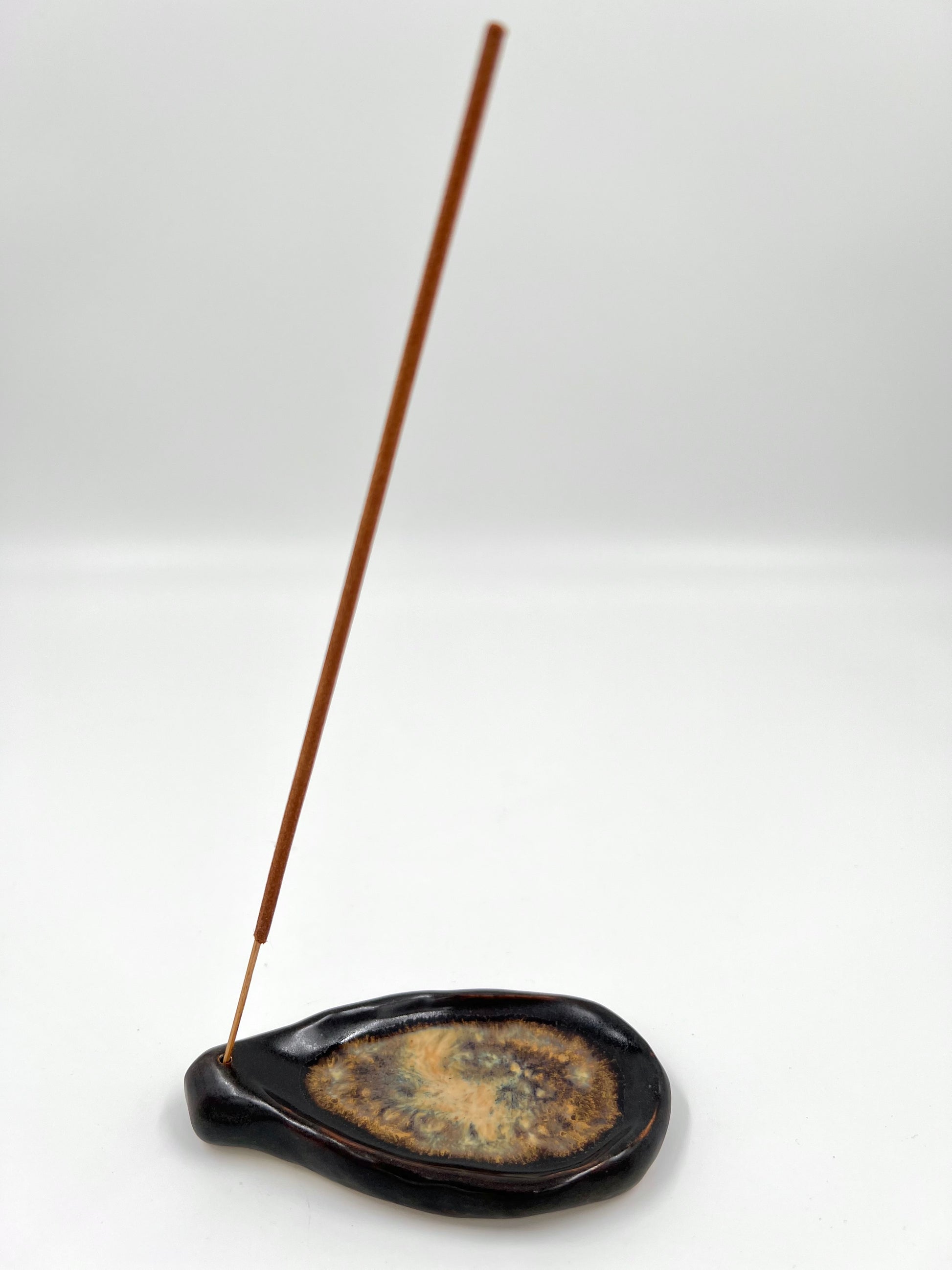 Rökelsehållare i matt brun och beige.