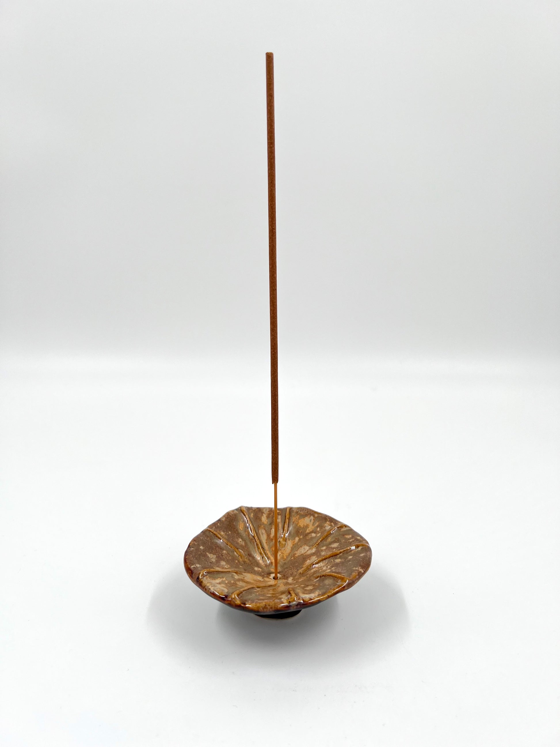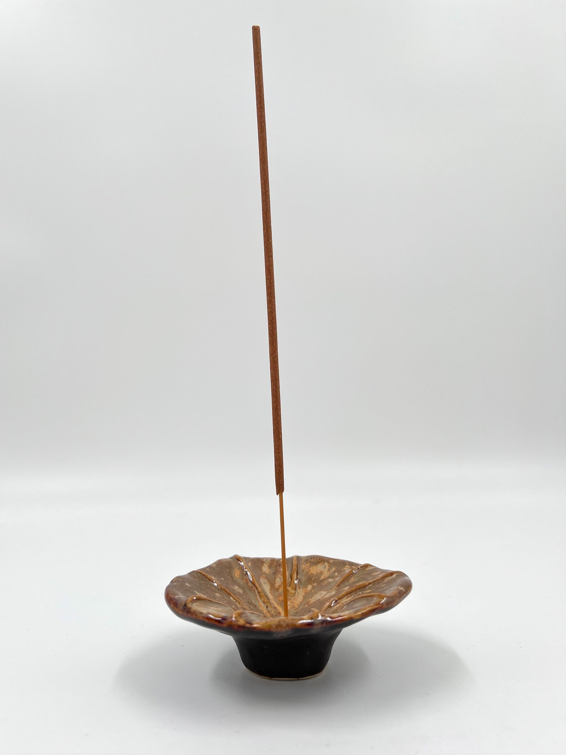 Rökelsehållare i brun och beige.