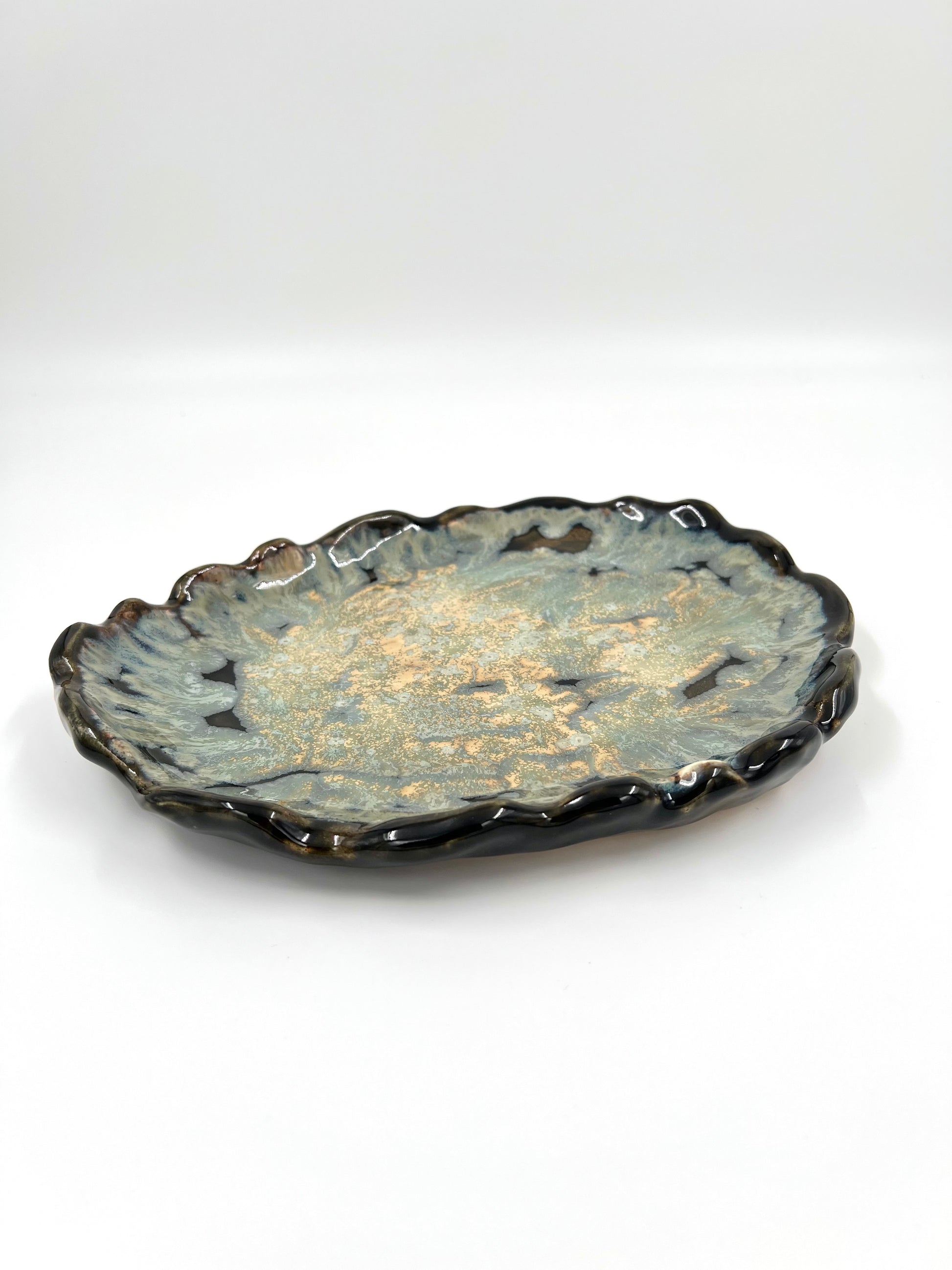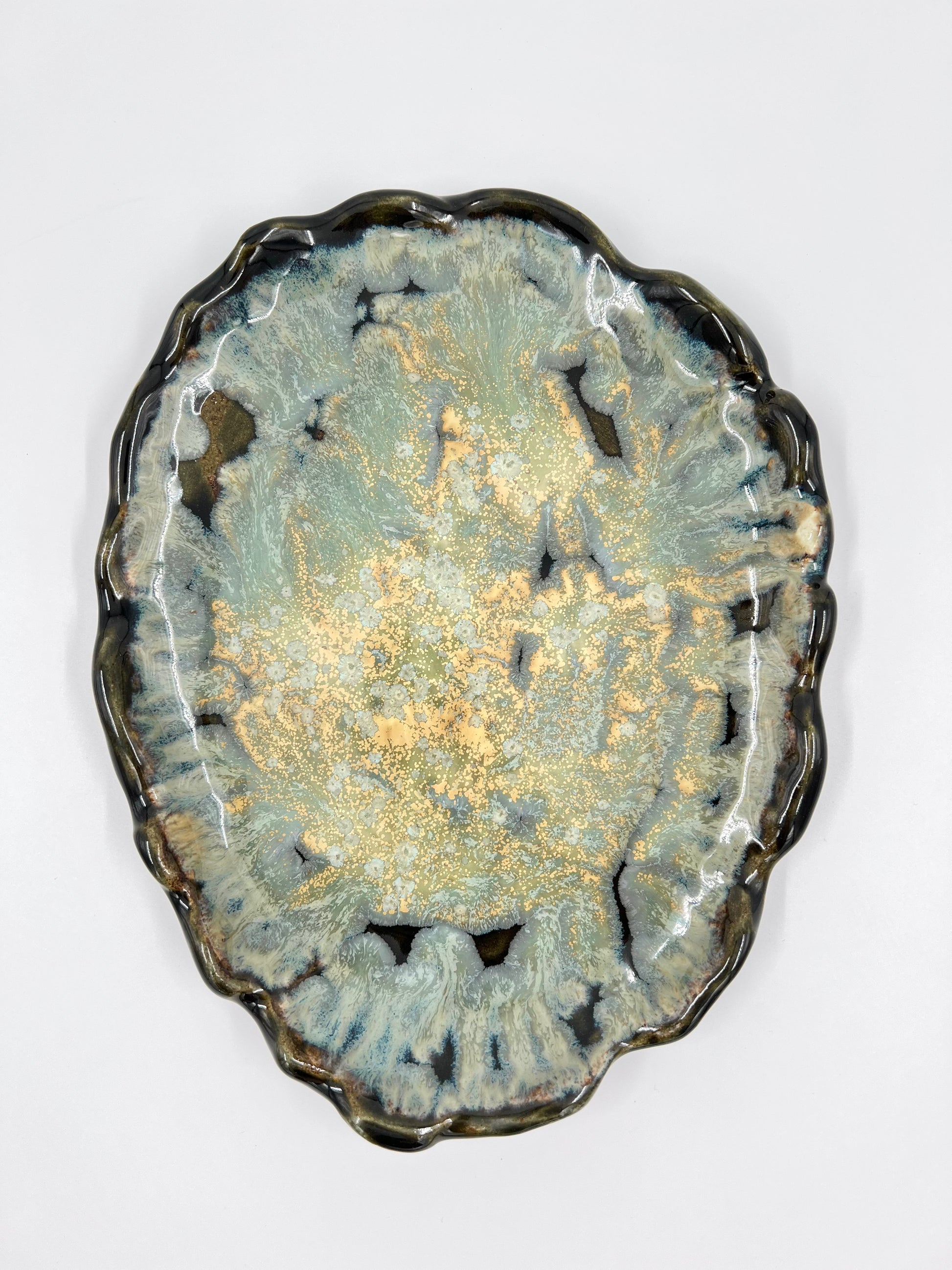 Stort fat i mörkgrön med nyanser av grön och beige.