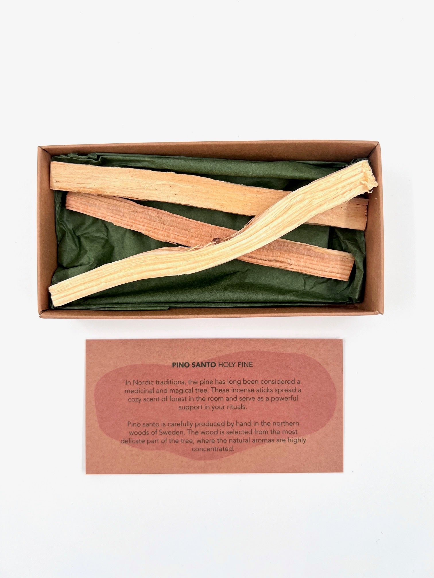 Handgjorda rökelsepinnar av svensk tall, naturligt rika på väldoftande oljor och kåda. 3-pack.