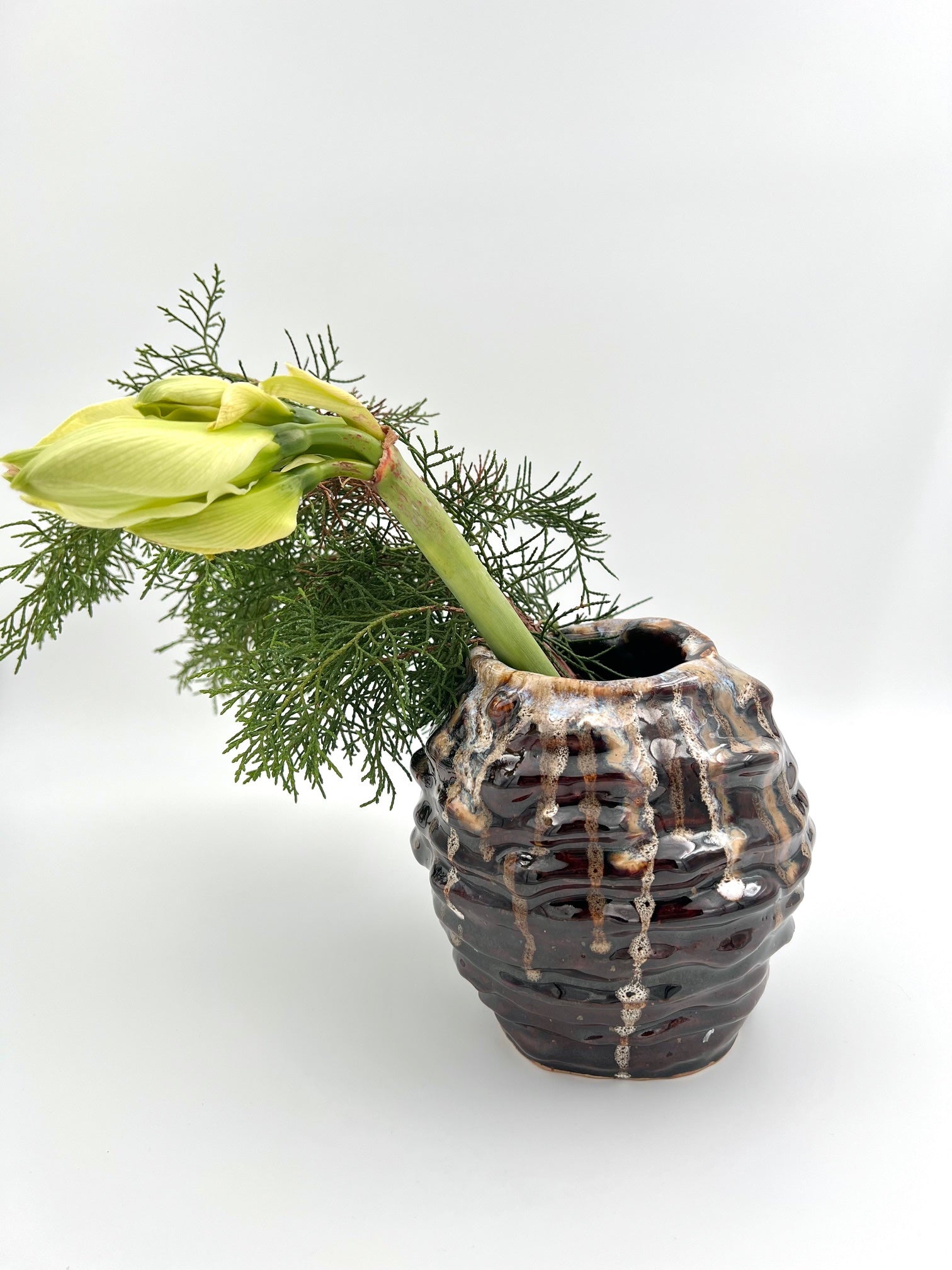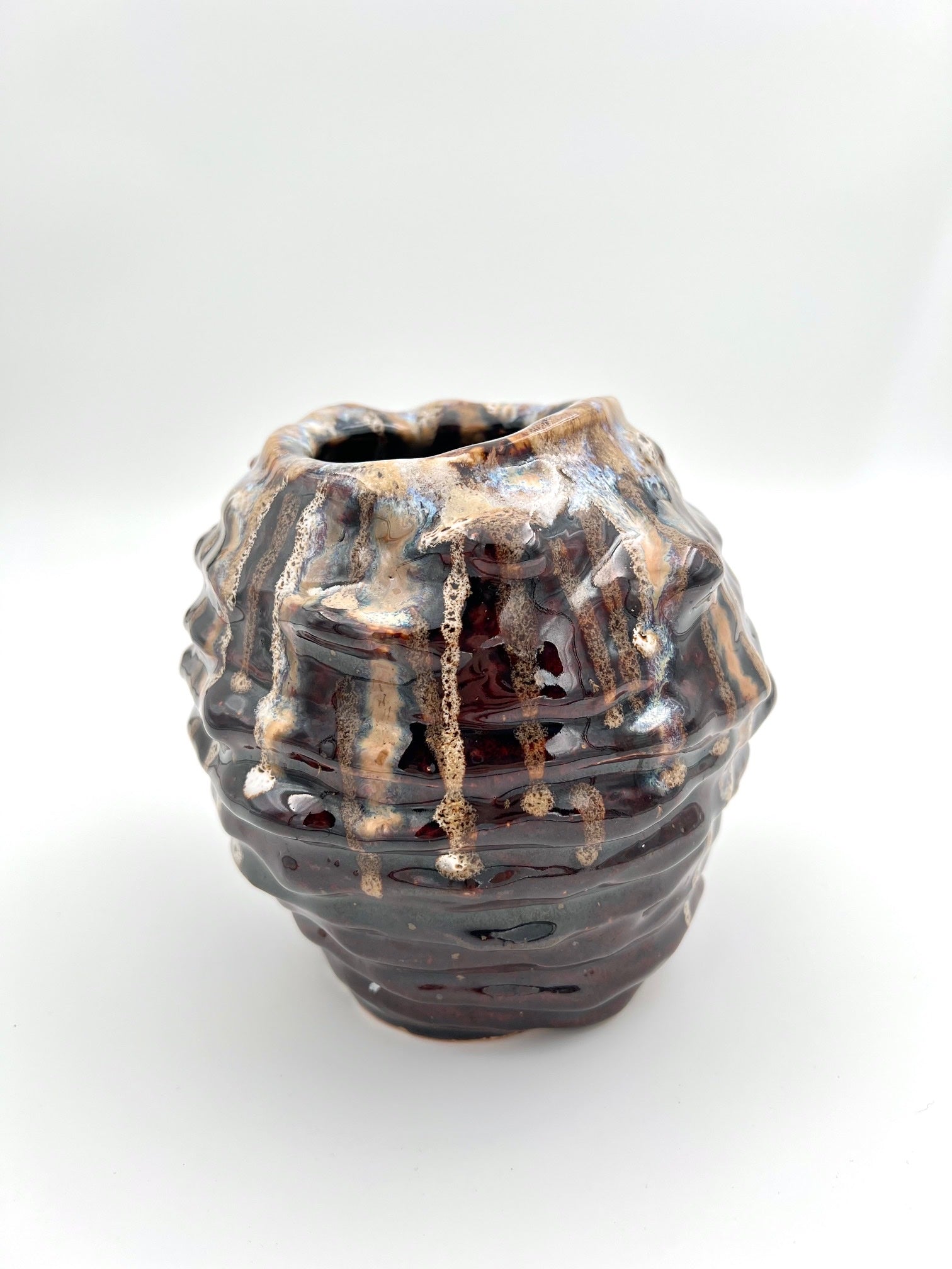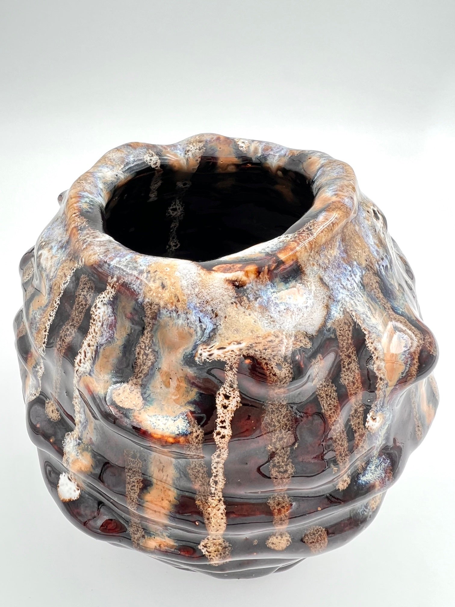 Rund vas i mörkbrun med beige, rosa, vit och ljusblå.